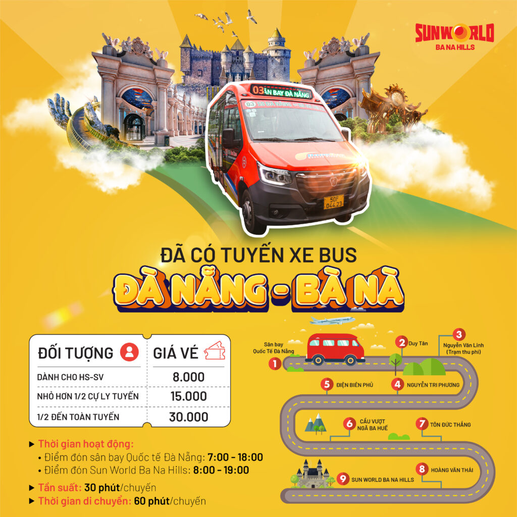 - – Hiện nay TP. Đà Nẵng cũng đã cung cấp dịch vụ xe bus đưa đón từ sân bay đến thẳng Bà Nà với giá vé linh động, tần suất trải đều trong ngày. Cả gia đình có thể nhanh chóng đi thẳng đến Bà Nà ngay sau khi vừa đáp chuyến bay đến thành phố biển xinh đẹp.