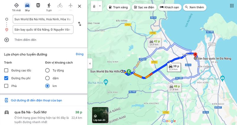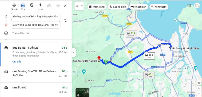 Một vài trường hợp du khách tra theo Google Maps thì khoảng cách từ sân bay Đà Nẵng đến Bà Nà hiện lên khoảng 40km, tuy nhiên đây là khoảng cách đã bao gồm cả đường lên đỉnh núi bằng cáp treo.
