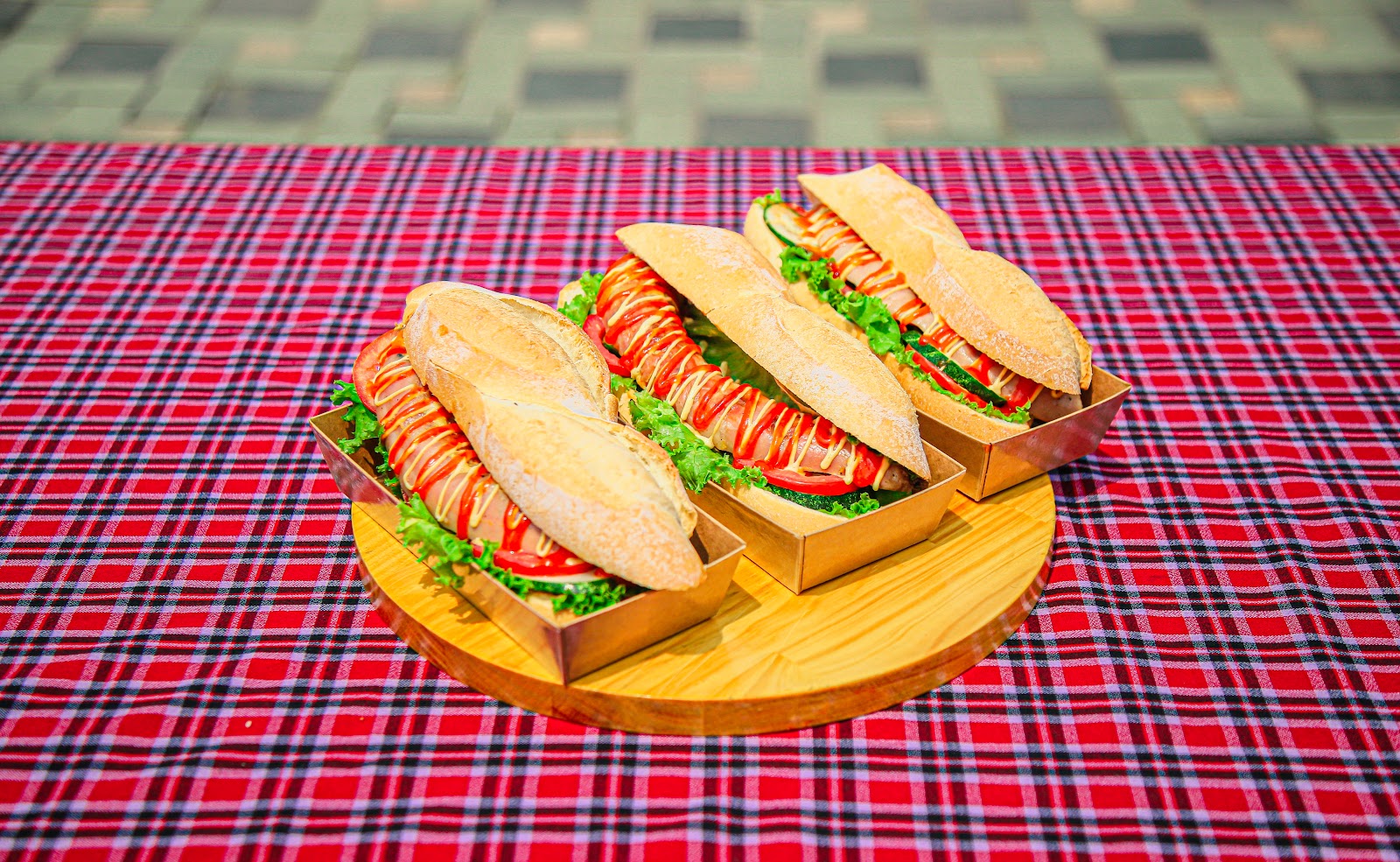 Cận cảnh món hotdog nóng hổi với vỏ bánh mì giòn rụm kết hợp cùng xúc xích Bà Nà thơm ngon