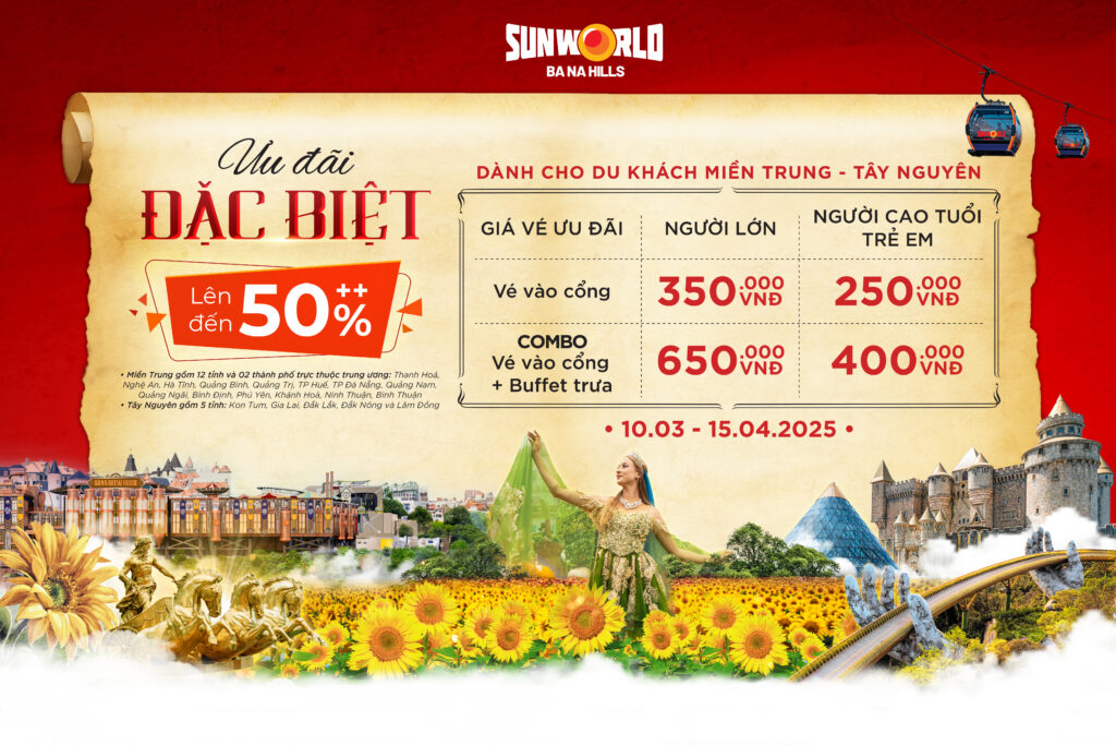 Cụ thể, từ ngày 10/3/2025 đến hết ngày 15/4/2025, giá vé dành cho khách đến từ 19 tỉnh thành miền Trung – Tây Nguyên chỉ còn 350.000 VNĐ/vé người lớn, 250.000 VNĐ/vé trẻ em (từ 1m-1,4m) và người cao tuổi trên 70 tuổi (du khách có năm sinh từ năm 1956 trở về trước). Với những khách mua combo bao gồm vé cáp treo và buffet trưa thì mức giá sẽ giảm tương ứng còn 650.000 VNĐ/1 combo cho người lớn và 400.000 VNĐ/1 combo cho trẻ em và người cao tuổi.