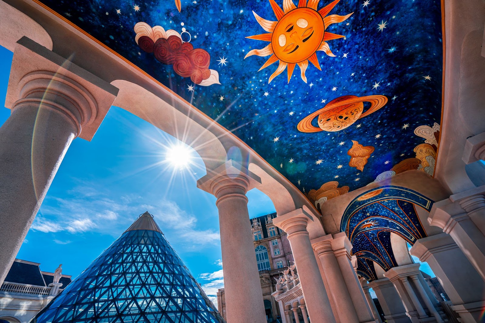 Ấn tượng nhất là tòa tháp kính hình chóp khổng lồ mang phong cách kiến trúc độc đáo dễ khiến du khách liên tưởng đến Bảo tàng Louvre lừng danh. Đặc biệt, khu vực này cũng nổi bật với vườn tượng 20 tác phẩm điêu khắc các nữ thần quan trọng nhất trong thần thoại Hy Lạp như: Hestia – thần của bếp lửa, Hebe – nữ thần của tuổi trẻ, con gái út của Zeus và Hera; Artemis – nữ thần săn bắn, chị em sinh đôi của Apollo, người được kính trọng bậc nhất của Hy Lạp cổ đại…