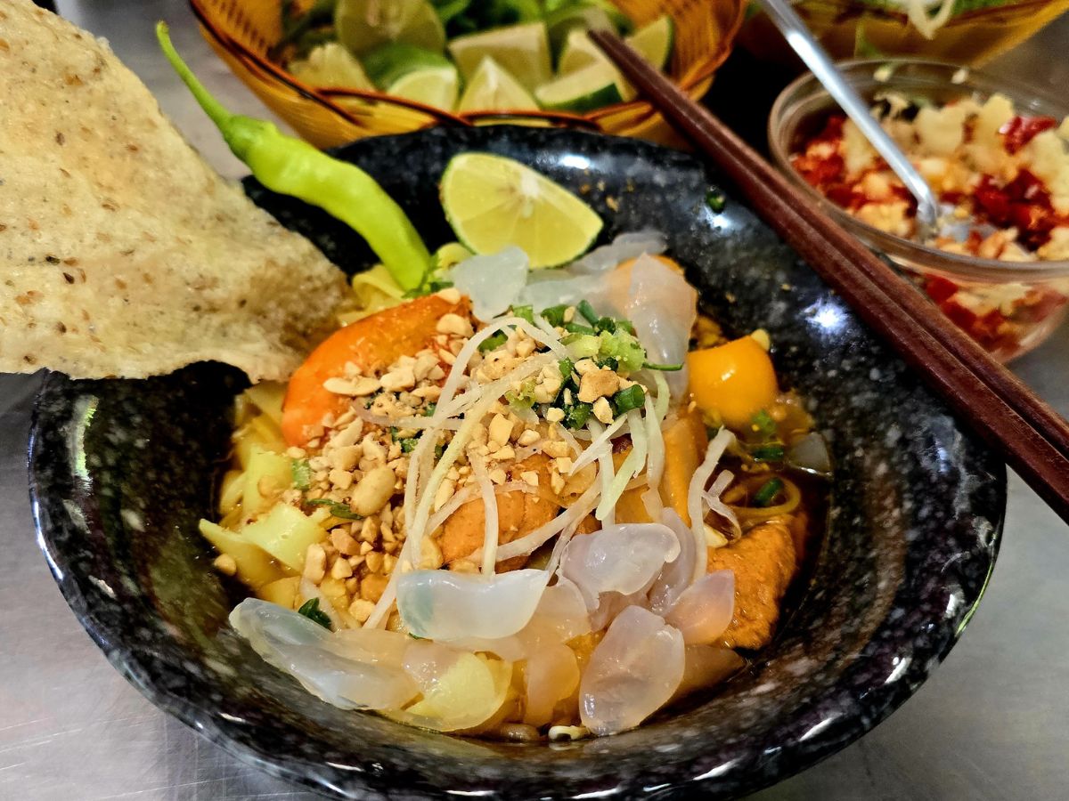 Đặc biệt, bánh xèo tại đây được làm theo công thức gia truyền với lớp vỏ giòn rụm từ bột gạo pha nước cốt dừa, nhân tôm tươi và thịt ba chỉ đậm đà. Bún bò Huế là món không thể bỏ qua, với nước dùng hầm từ xương heo suốt 12 tiếng cho hương vị đậm sâu. Và không thể không nhắc đến chả cá Đà Nẵng, ăn kèm nước mắm pha đặc biệt – một “dấu ấn riêng” tạo nên sức hút bền vững cho thực khách trong và ngoài nước.